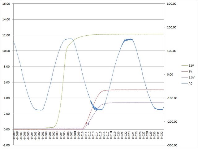 ○電源啟動至綜合全負載輸出狀態,12V上升時間16ms,5V上升時間7ms,3.3V上升時間
