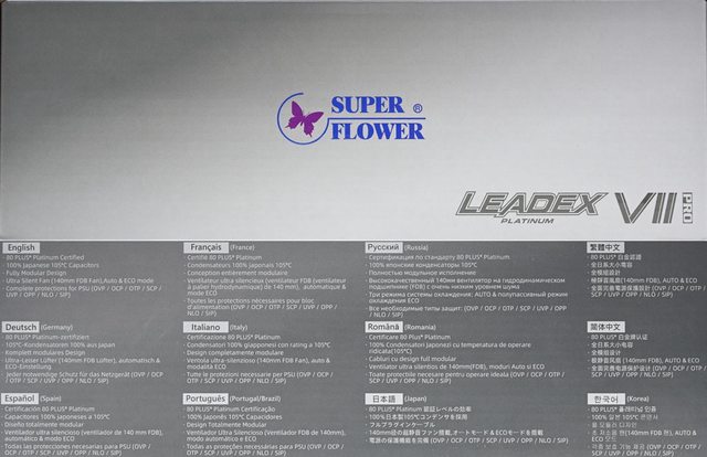 ▼外盒上側面有Super Flower商標及LEADEX VII PRO標誌;外盒下側面有多國語言產品特