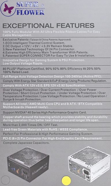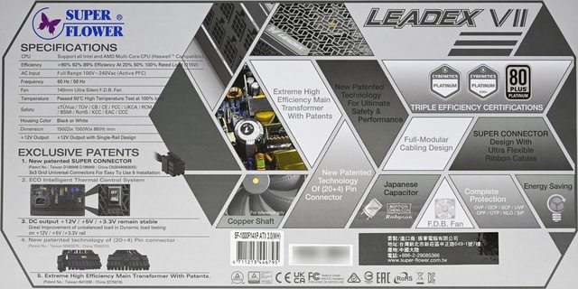 ▼外盒背面有Super Flower商標、LEADEX VII標誌、規格表、獨家專利介紹、