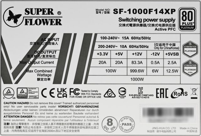 ▼本體背面標籤有Super Flower商標、SF-1000F14XP型號、80PLUS白金認證、輸入電壓/