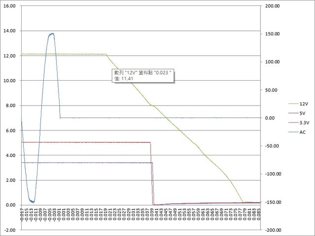 ○綜合全負載輸出狀態切斷AC輸入模擬電力中斷,12V於20ms開始壓降,23ms降至11.41V