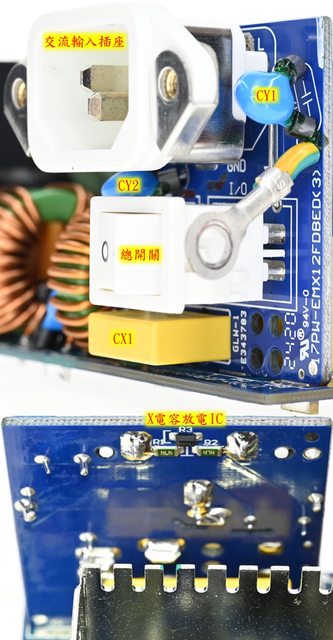 ▼交流輸入插座及總開關裝在小電路板再焊接至主電路板,正面有2個Y電容(CY1/CY2)及1