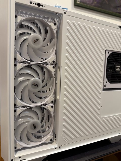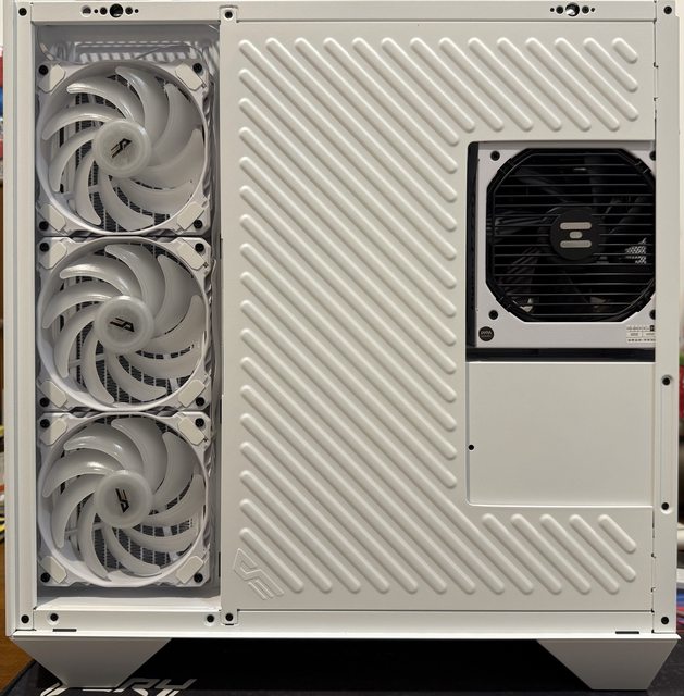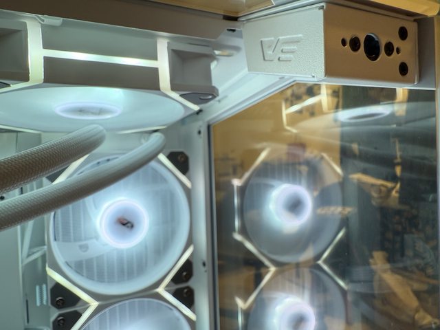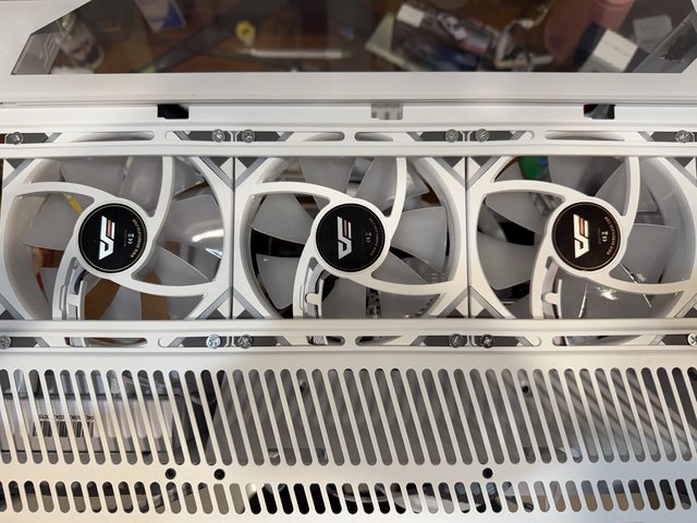 既然側裝水冷,另購三顆風扇頂置,頂架貌似也被省掉了,歪七扭八的,