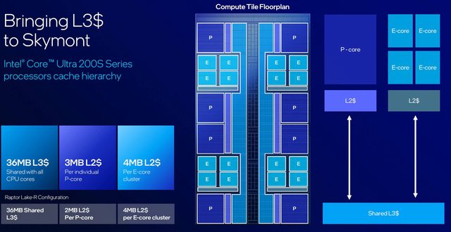 TEL SMART CACHE TECHNOLOGY 實現。以 285K 8P16E 來說,PCORE 每顆都是 PER CORE 3MB