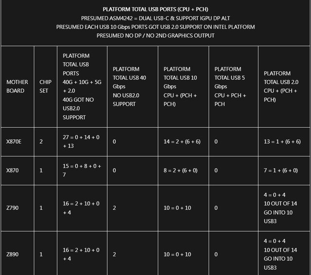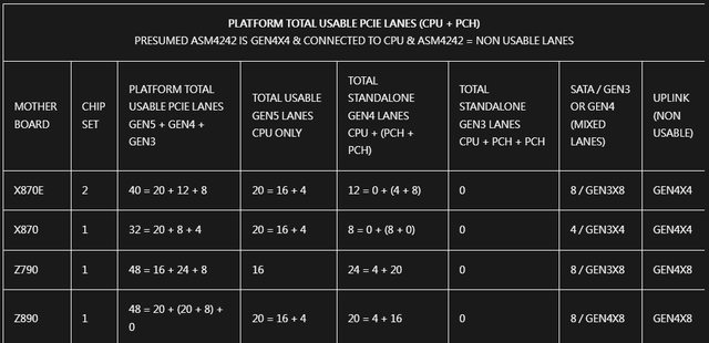 以下的表格,筆者刻意把 ASM4242 所佔用的 PCI-E 通道以及 USB 視為不可用。因為 ASM4