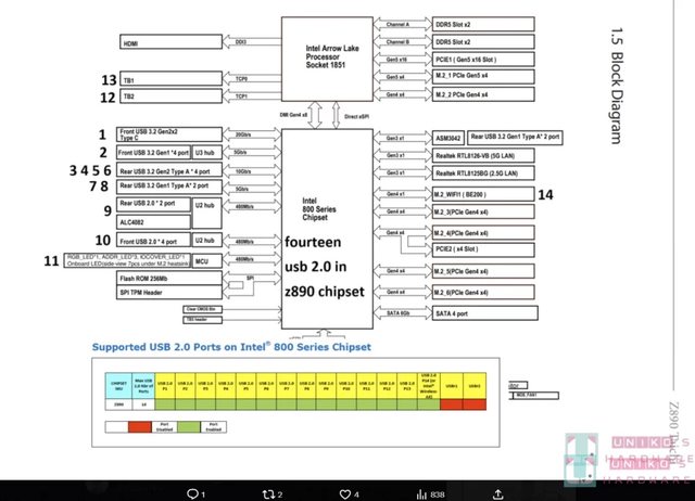 不過由於 CPU 那邊新增原生的 TBT USB4 40 Gbps 共 2 個,晶片組的 USB 2.0 或需要供