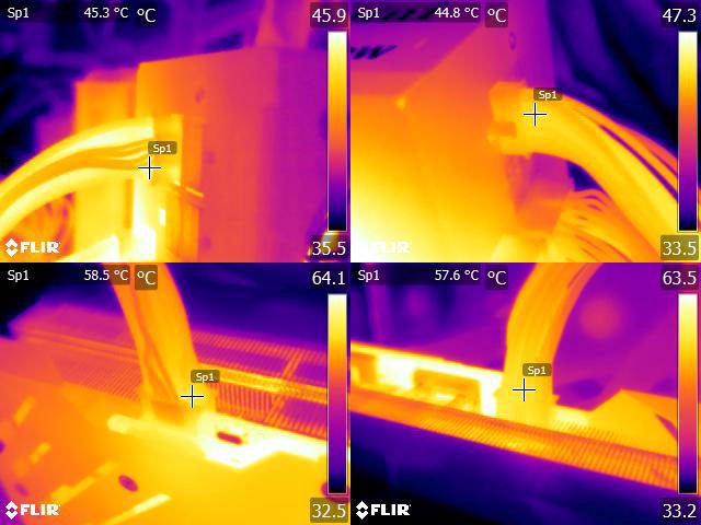 ▼執行FURMARK 30分鐘後電源端插頭(左上/右上)及顯示卡端插頭(左下/右下)的紅外線熱