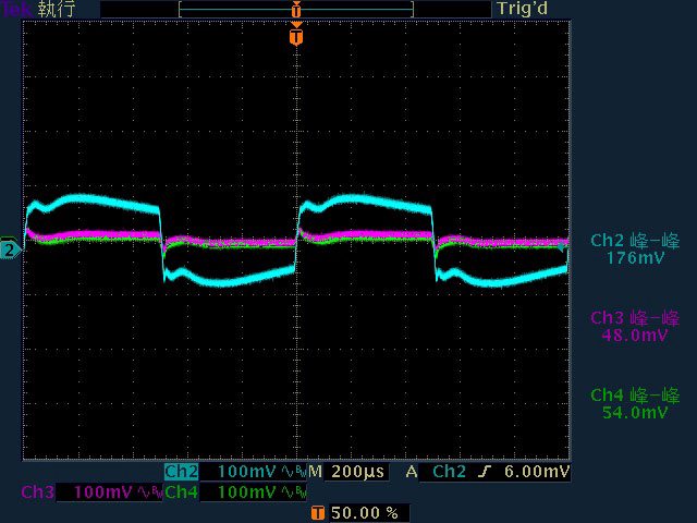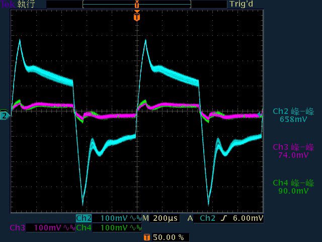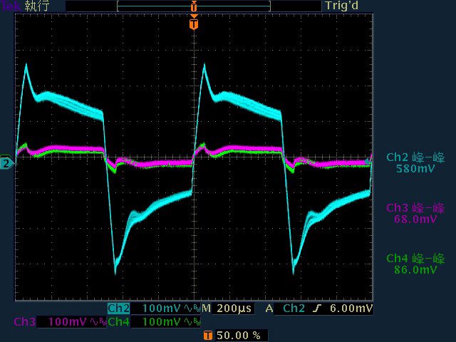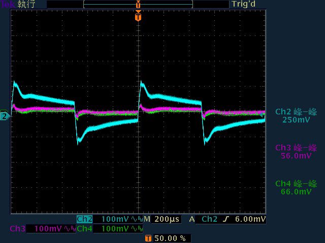 以下波形圖,CH2藍色波形為12V電壓波形,CH3紫色波形為5V電壓波形,CH4綠色波形為