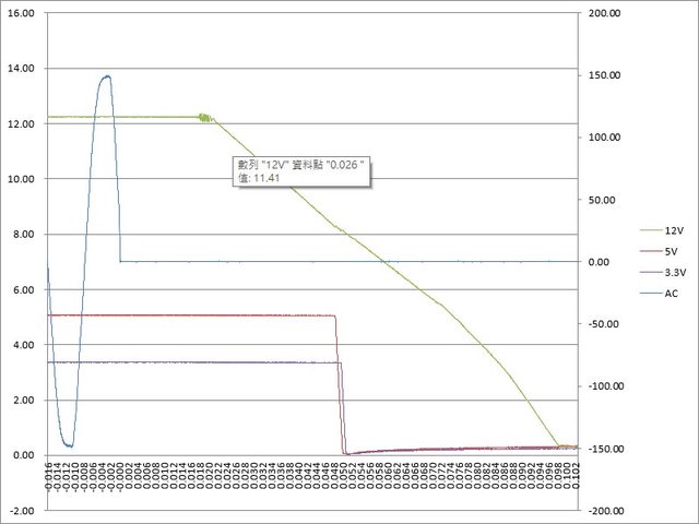 ▼3.3V/12A、5V/12A、12V/90A滿載輸出下斷電的Hold-up time時序圖,從交流中斷處當