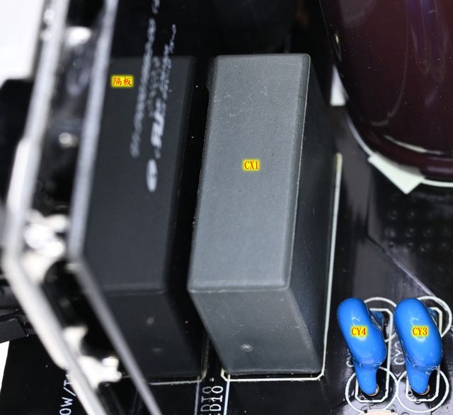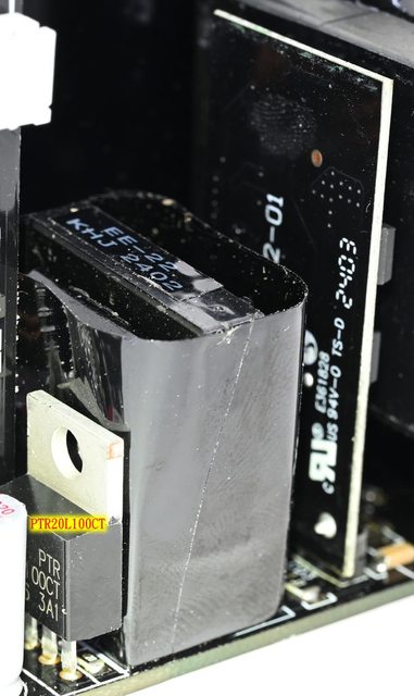 ▼逆轉彈塵開關焊點及線路有包覆套管,黑色隔板於主電路板二次側區域開孔及貼上導熱