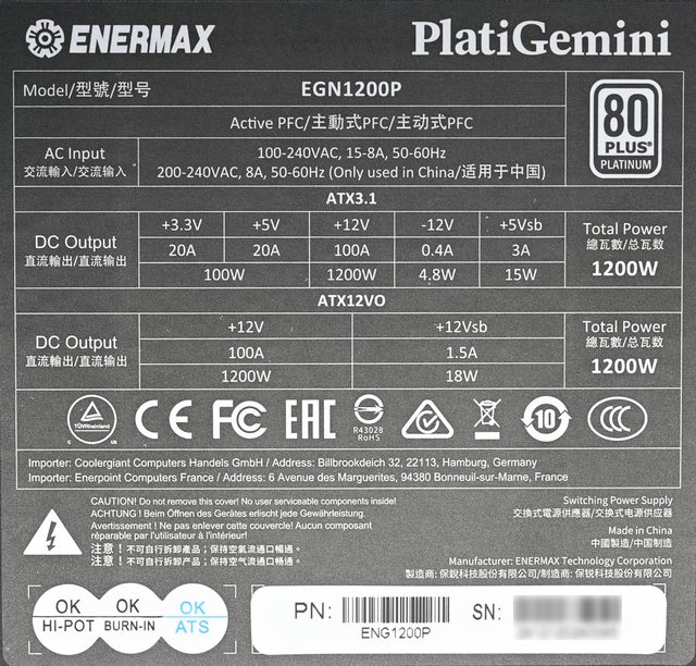 ▼本體背面標籤有ENERMAX商標、PlatiGemini標誌、EGN1200P型號、輸入電壓/電流/頻率
