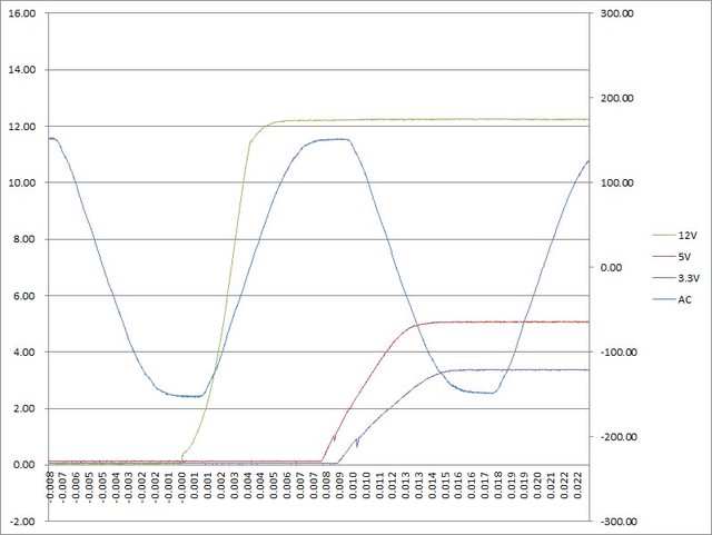 ○電源啟動至綜合全負載輸出狀態,12V上升時間9ms,5V上升時間7ms,3.3V上升時間7ms