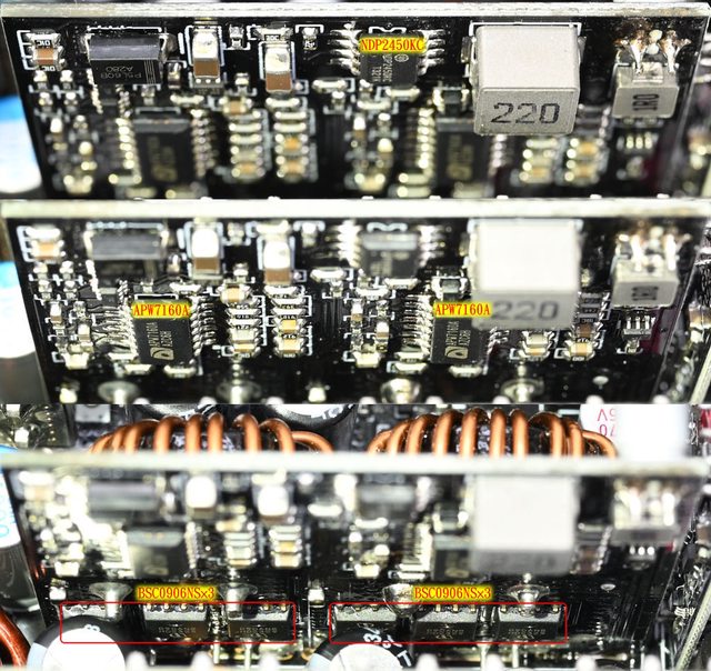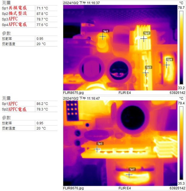 ▼電源供應器滿載輸出下共模電感/橋式整流/APFC/APFC電感(上圖)及APFC/APFC電感(下