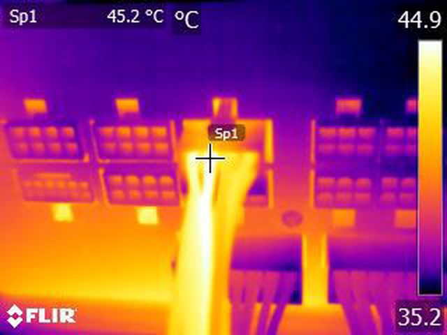 ▼單條PCIE 6+2P連續輸出21A(252W)10分鐘後的電源端模組化接頭紅外線熱影像圖(附註