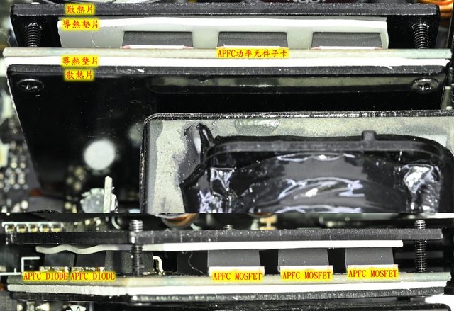 ○採用表面黏著封裝APFC及一次側功率元件,分別安裝在獨立子卡上,APFC功率元件子卡
