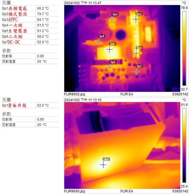 ▼電源供應器滿載輸出下內部(上圖)及背面外殼(下圖)的紅外線熱影像圖(附註:安裝位