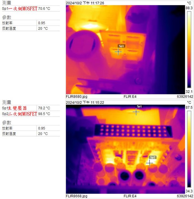 ▼電源供應器滿載輸出下一次側MOSFET(上圖)及主變壓器/二次側MOSFET(下圖)的紅外線