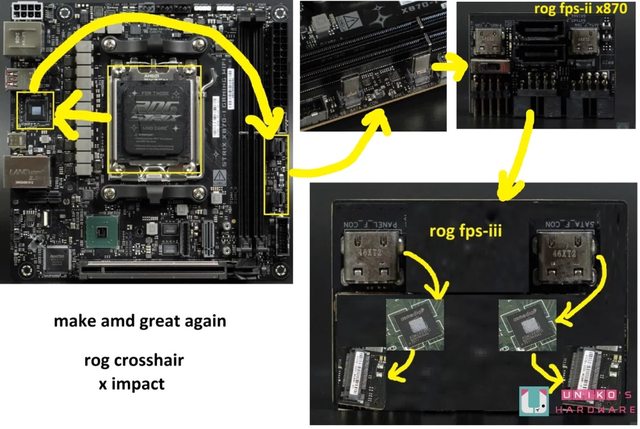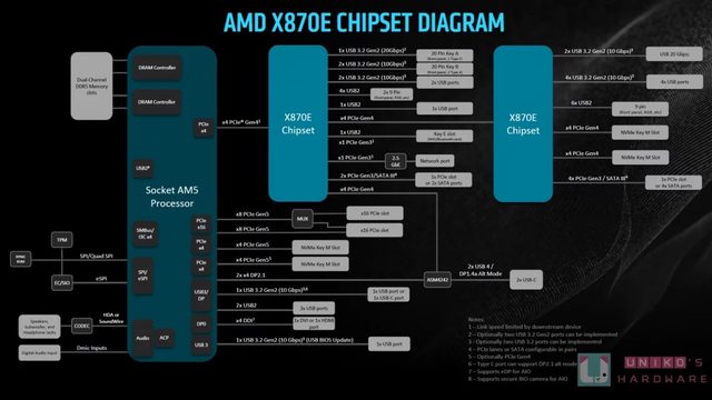 ‧ 雙晶片組設計是串連做法,以 GEN4X4 串連意味 X870E / X670E 的晶片組總 GEN4 通道