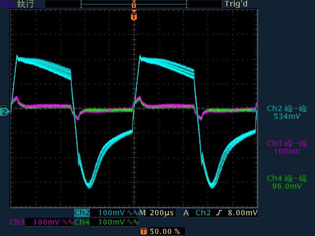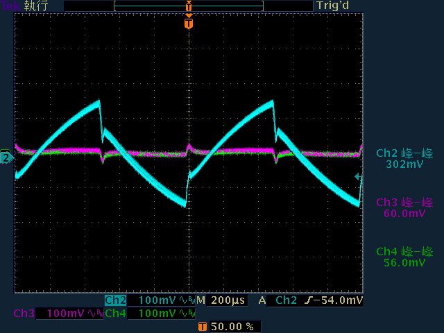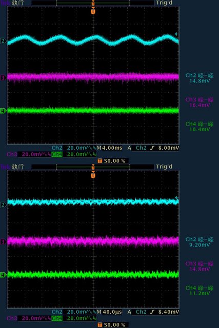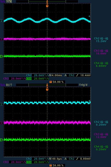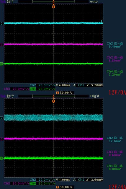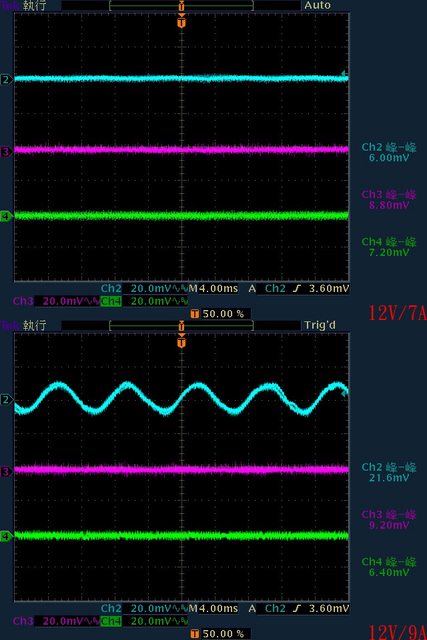 負載輸出下12V/5V/3.3V各路低頻漣波分別為15.2mV/10mV/8.8mV