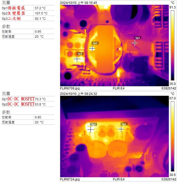 ▼電源供應器滿載輸出下諧振電感/主變壓器/二次側(上圖)及DC-DC MOSFET(下圖)的紅外