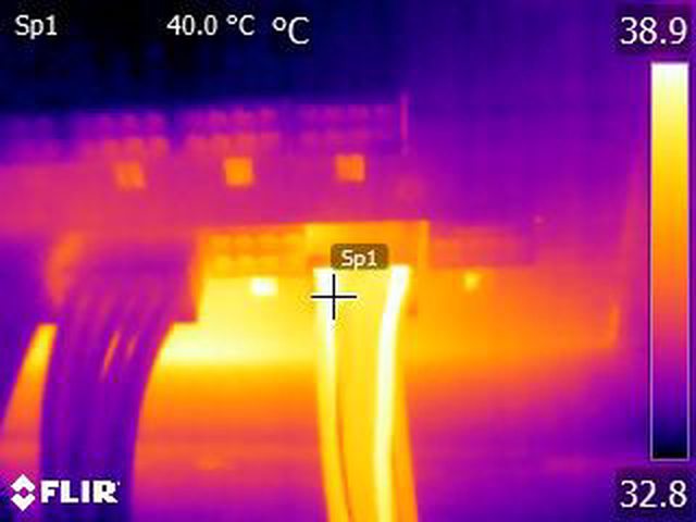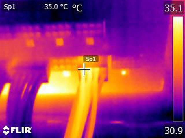 ▼單條PCIE 6+2P連續輸出21A(252W)10分鐘後的電源端模組化接頭紅外線熱影像圖(附註