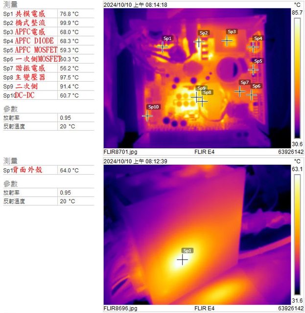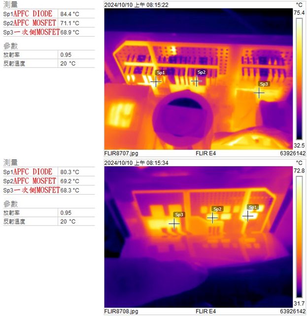 ▼電源供應器滿載輸出下內部(上圖)及背面外殼(下圖)的紅外線熱影像圖(附註:安裝位