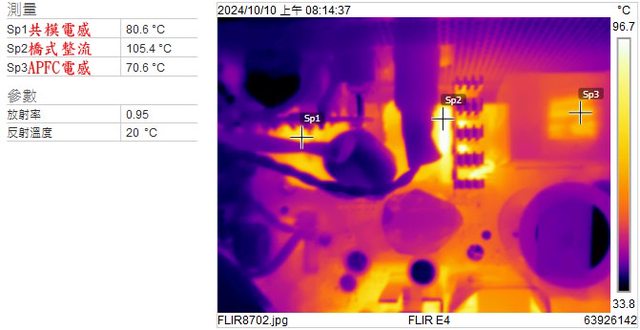 ▼電源供應器滿載輸出下共模電感/橋式整流/APFC電感的紅外線熱影像圖(附註:安裝位
