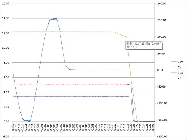 ○綜合全負載輸出狀態切斷AC輸入模擬電力中斷,12V於16ms開始壓降,19ms降至11.38V