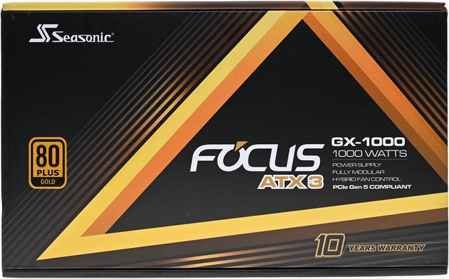 ▼外盒正面有Seasonic商標、80PLUS金牌認證、FOCUS ATX 3標誌、GX-1000名稱、輸出功