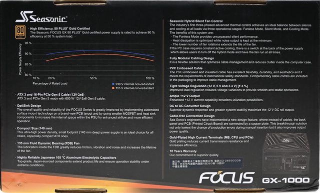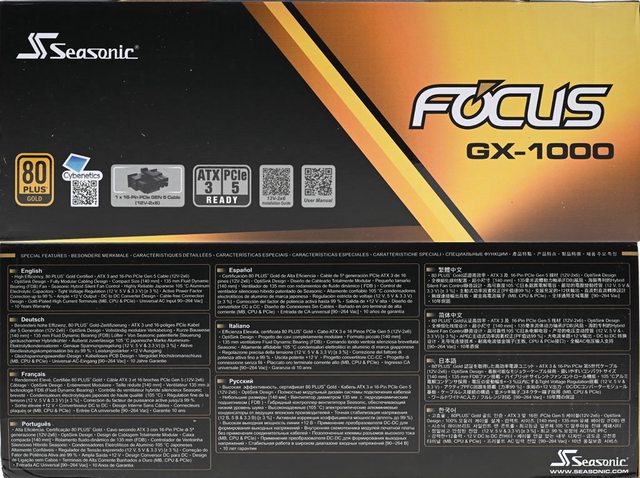 ▼外盒上側面有Seasonic商標、FOCUS標誌、GX-1000名稱、80PLUS金牌認證、Cybenetics