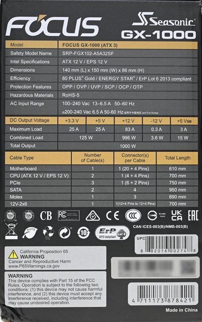 ▼本體背面標籤有Seasonic商標、FOCUS標誌、GX-1000 ATX 3名稱、警告訊息、