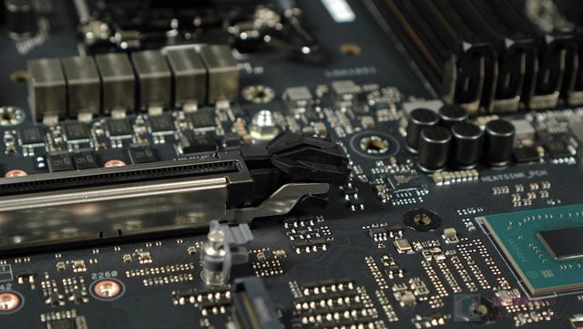 巨大的 M.2 散熱器為 CPU GEN5X4 M.2 獨立插槽提供充足散熱能力,免螺絲的設計使拆裝