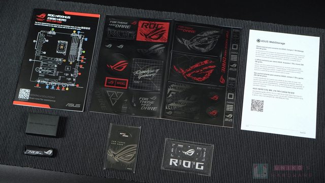 份 ROG 信仰貼紙、一份 ASUS WEBSTORAGE 的介紹、一個 ROG USB 隨身碟、一張能放進錢