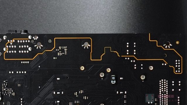 2 散熱器左方,承接上半部金色斜切面,繼續往右看至南橋散熱側邊,就能看到與之呼應的