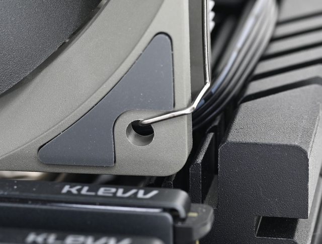 ▼從側面看,壓板兩邊設置鎖在托架上的彈簧螺帽,壓板中間用1個手轉螺絲固定在散熱