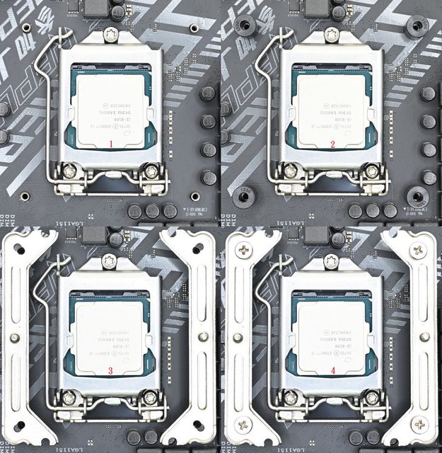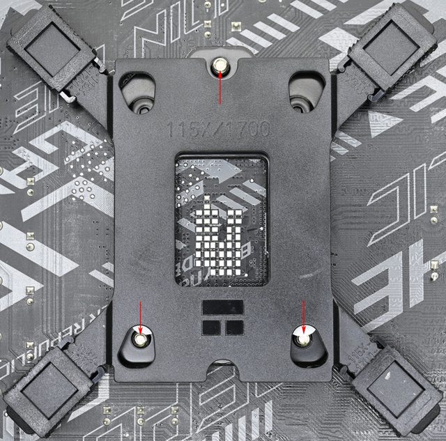 LGA1200/115x黑色套管套上固定鎖點(2),放上托架(3),用4個Intel托架固定螺絲鎖緊