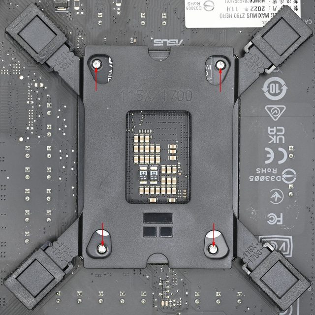 背板開口處需對準處理器扣具底板4個螺絲鎖點位置(紅色箭頭)