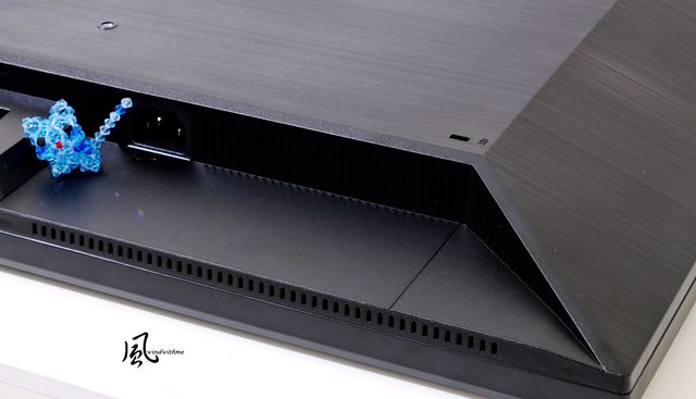 背面右下為電源輸入孔,右上方Kensington防盜鎖,下方長條型散熱孔位。
