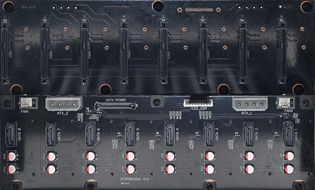 ▼抽取槽的SATA背板具備2個3pin風扇插針、2個大4P及1個SATA電源輸入連接器
