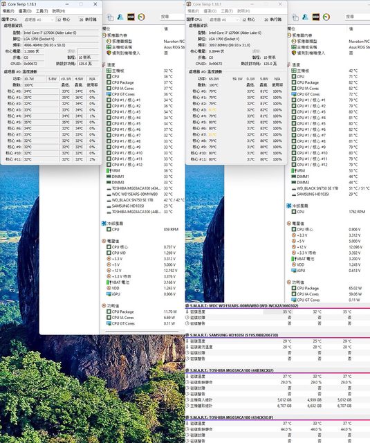 ▼CPU+HDD高負載前(左)及高負載30分鐘後(右)Core Temp、AIDA64、HWiNFO感測器頁面
