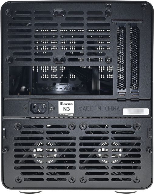 ▼後方左上可裝2個80mm風扇,右上有2個標準擴充槽,中間左側有C14交流輸入插座,下