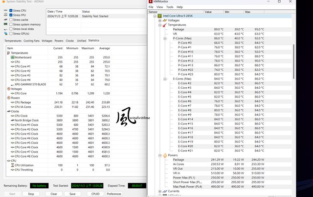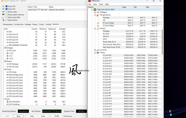 對照組285K以Extreme模式搭載INWIN MR36水冷運行AIDA64 Stress CPU、FPU全速時: