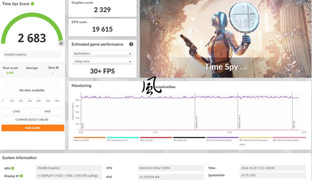 285K搭配風冷在BIOS設定Intel Extreme模式燒機時脈相當穩定,Performance模式時脈比