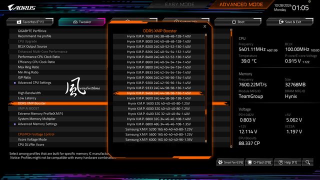 新增XMP AI BOOST新選項,並提供XMP Booster、Auto Booster、High Bandwidth、Low
