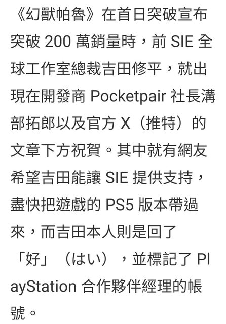 → set852064: 等吉田的好消息,希望未來主機版能彼此互通 01/22 22:27
