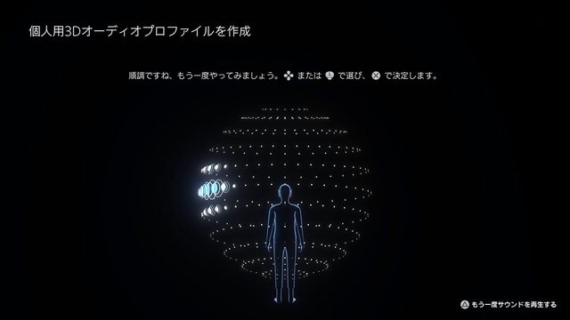 戴上耳機後,進入設定有兩種過程,第一種是玩家聽到三維空間音效後,用控制器指出聲音