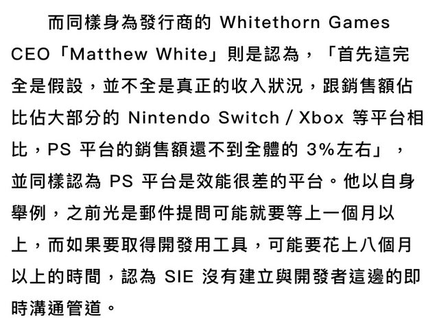 現在比較疑惑的是為什麼台灣Steam都已經能預購了,但台灣PSN只有上架但不能預購, 還有售價方面是不是廠商說了算?因為以往售價幾乎都是參考美日訂價,PSN也要抽成,但? 服真的賣美日換算的價格一定又炸鍋XD PSN遊戲看上面推文裡,遊戲基地那篇獨立開發商抱怨的文章,似乎不是設定完就能直接放? 去的,是要申請過再給SIE指派的帳號管理人登錄? 文章裡也有人指出,光是郵件提問可能就要等一個月以上了 https://i.imgur.com/yngck32.jpeg