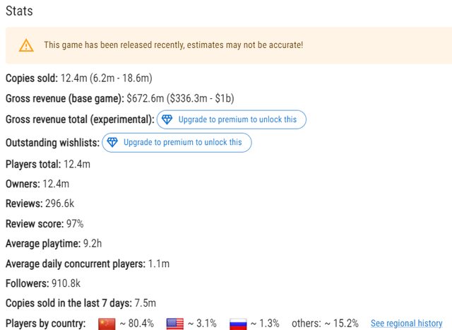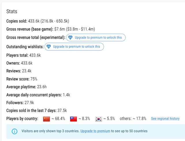 : 結果幾乎都你強國人買的 == : 看推文有人提活俠銷售 : 補個資料 : https://gamalytic.com/game/1859910 : https://i.imgur.com/ryeyXh5.png