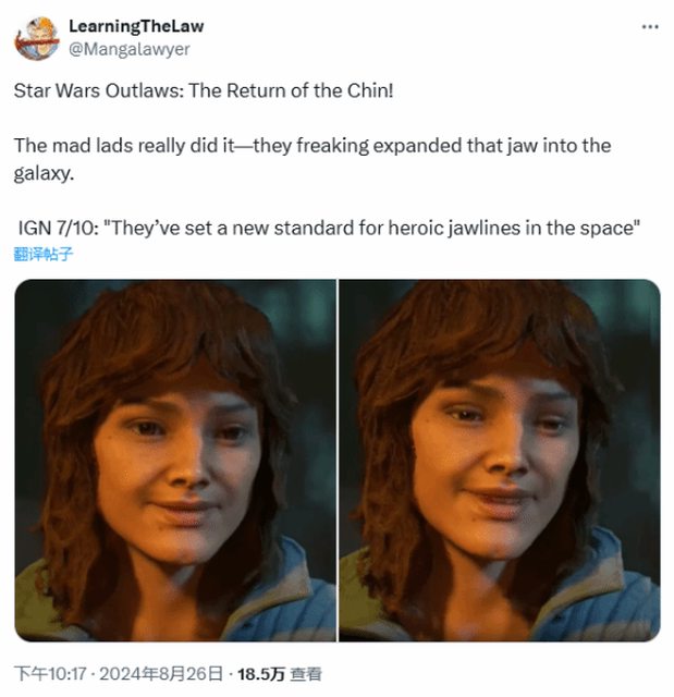 育碧星戰題材大作《星際大戰:亡命之徒》即將發售,遊戲女主Kay Vess成為了玩家們討 論的焦點。然而這次,焦點則聚集在了Kay Vess的下巴上。 Mangalawyer談到了Kay Vess,並將《星球大戰:亡命之徒》戲稱為“《星際大戰亡命之 徒:下巴歸來》”。 Mangalawyer表示:“這些開發者真的做到了,他們把Kay Vess的下巴擴張到了銀河系。 IGN的7分評價裡應有這樣一條——‘他們(開發者)為遊戲界英雄下巴的線條樹立了新標 準’。” 還有玩家將Kay Vess與其臉模進行了對比,一位玩家無奈表示:“她就是Kay Vess的臉模 ?天哪,她太美麗了,開發者為什麼這樣對待一位臉模?” https://i.imgur.com/Gw4DQmg.jpg