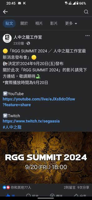 「RGG SUMMIT 2024 / 人中之龍工作室最新消息發布會」 決定於2024年9月20日(五)發布 關於此次「RGG SUMMIT 2024」的影片請見下方連結,敬請期待 *實際播放時間為9月20日 ▶YouTube https://youtube.com/live/eJXs8dcOfow?feature=share ▶Twitch https://www.twitch.tv/segaasia #人中之龍 http://i.imgur.com/w67x0JC.jpg